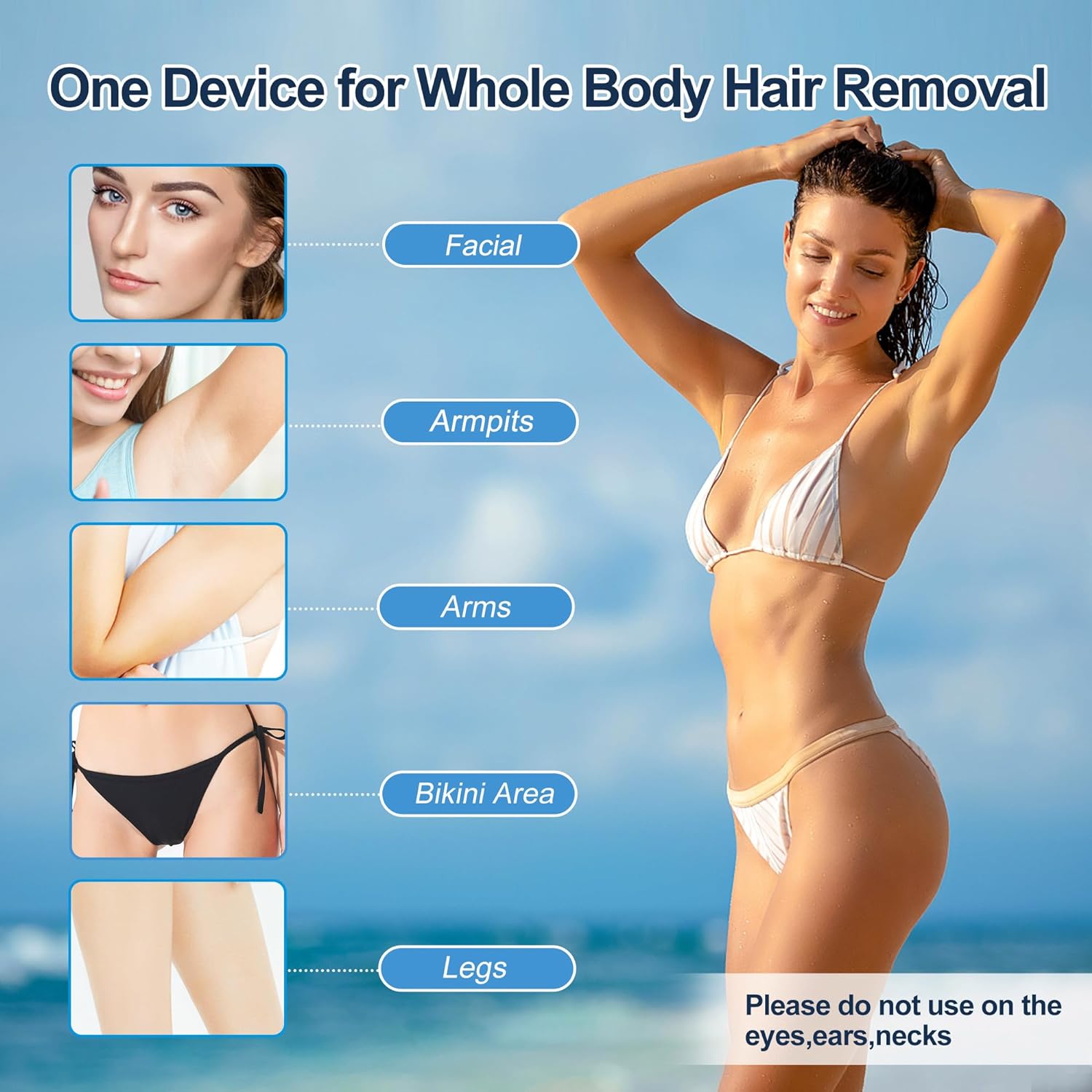 - Advanced Permanent Hair Removal Technology: The Painless Hair Remover utilizes IPL (Intense Pulsed Light) laser technology to break the cycle of hair regrowth, leading to permanent hair reduction over time. Designed to target hair follicles at the root, it effectively removes hair from various areas of the body, including the face, arms, legs, underarms, and bikini line. Its gentle yet powerful technology makes it especially suitable for sensitive areas, ensuring a smooth, irritation-free experience.